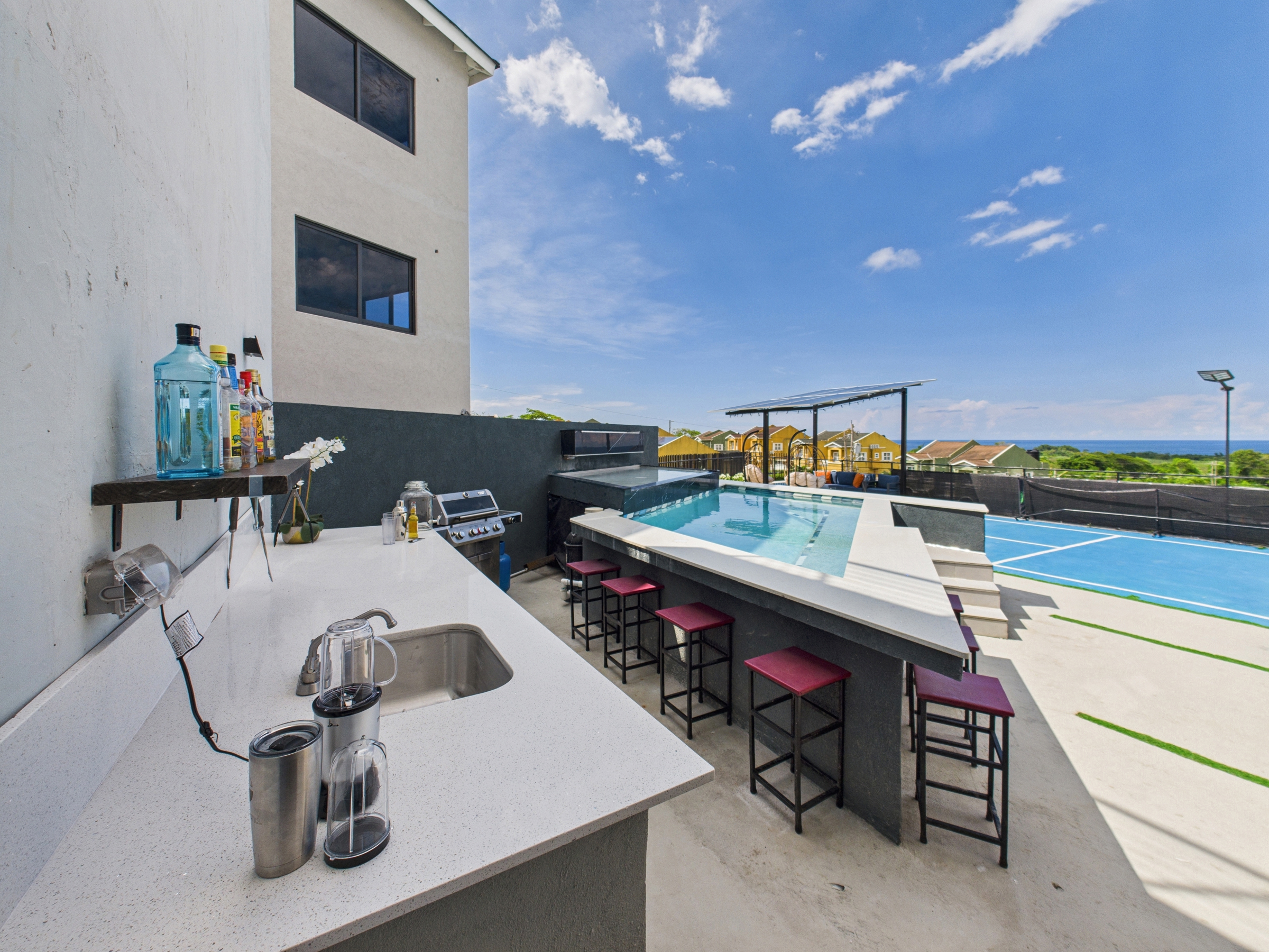 Welcome to Villa Palaav—a sleek, modern contemporary oasis in a private gated community. This eco-luxury 6 bedroom Villa features 3 spacious two-bedroom apartment style King suites with their own private kitchens, with 1-2 bathrooms, and open concept living areas. Soak in breathtaking ocean views from 5 of 6 bedrooms, balconies, and sun decks. Enjoy a private pool, pickleball court, billiards room, and mini golf. Sustainable design includes solar power, rainwater harvesting, and smart cooling.